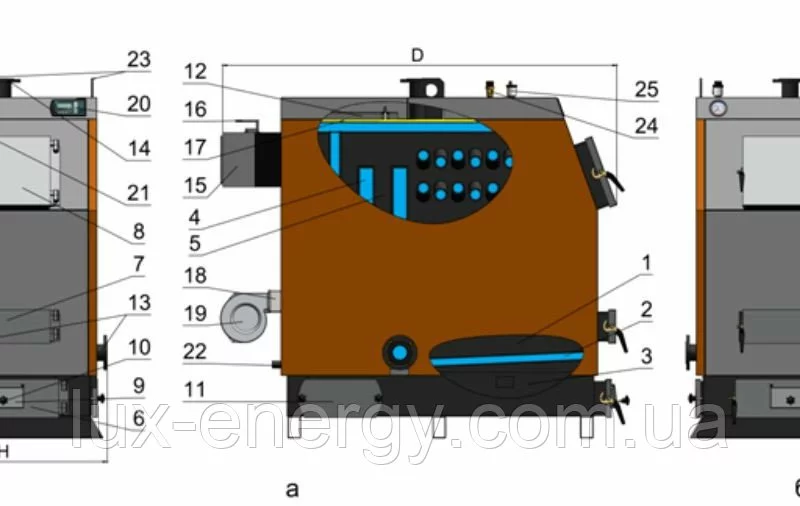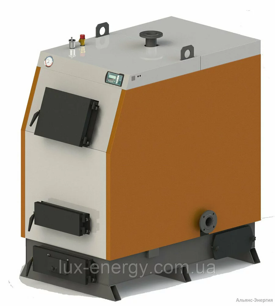 Котлы отопительные твердотопливные водонагревательные стальные модели КВ имеют вертикальное расположение каналов газохода. Были предусмотрены для использования в различных целях: горячая водоподготовка, обогрев помещений, установка на объектах строгого поддержания стабильной температуры (в модульном исполнении). Являются также, как и котлы модели КГ универсальными, разработаны с учётом использования всевозможных разновидностей твердого топлива, которое более доступно потребителю. Водные колосники, наличие бесшовных жаропрочных труб (расположенных с перекрёстным уклоном в топке), а также вертикальная система каналов газохода теплообменника котла увеличивают площадь поглощения тепловой энергии, делая котлы экономичными и эффективными. Использование новейших процессорных контроллеров для управления за процессом горения топлива в паре с нагнетающим вентилятором легко адаптирует котлы к роботе на том либо ином виде топлива, на котором они будут работать и к температурным требованиям обогреваемого объекта, поддерживая стабильность температур теплоносителя и воздуха обогреваемых помещений. Котлы с принудительной системой распределения и подачи необходимого количества воздуха через воздушные золотники непосредственно в топку, относятся к числу полугазогенераторным, а по техническим данным не уступают газогенераторным (пиролизным) котлам, даже имеют ряд преимуществ: независимость к виду топлива, простота в пользовании, небольшой период окупаемости.