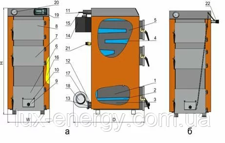 а – котел типа КГ с электронным блоком управления и нагнетающим вентилятором;