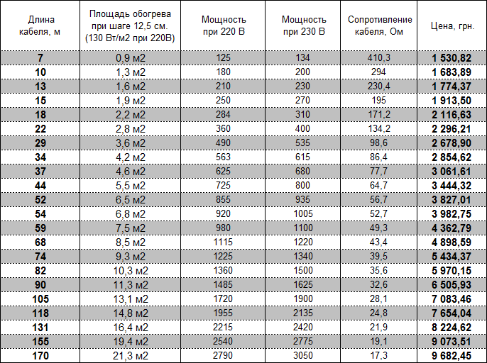 - Ориентировочная площадь укладки, м2 (135...170 Вт/м2)