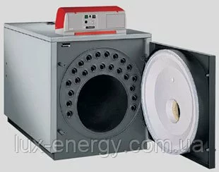 Общее описание конструкции Продукты сгорания по трубам конвективной поверхности поступают в газообразный коллектор в задней части котла, оснащенный газоотводящим патрубком. Для интенсификации теплообмена все трубы конвективной поверхности оснащаются турбулизаторами из жаропрочной стали. Внешний кожух котла изготовлен из стальных панелей, покрытых порошковой эмалью. Толщина теплоизоляции из минеральной ваты равна 60 мм. Жаровые трубы котла размещены более чем на 60% в верхней части котлового блока, в результате чего значительно снижается возможность образования конденсата при пониженной температуре обратной линии. Выпуск жаровых труб со стороны задней трубной доски способствует повышению температуры в конечной части труб, предохраняя их от коррозии. Фронтальная дверь снабженная регулируемыми петлями, может быть навешена как с правой, так и с левой стороны. Стандартная комплектация котла Панель управления котла в составе: